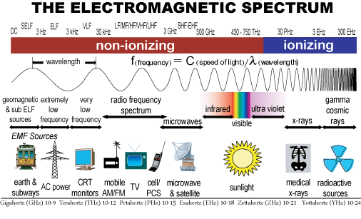 In contrast, the electromagnetic radiation frequencies that are higher (faster) than visible light are called “ionizing radiation” because they have enough energy to disrupt or “ionize” molecules, and thus are potentially very dangerous to biological organisms. Ionizing radiation includes X-rays and the various nuclear radiations, which are clearly known and accepted as being hazardous to human health like radioactive material such as plutonium, uranium, radium, radon gas or gamma rays etc.